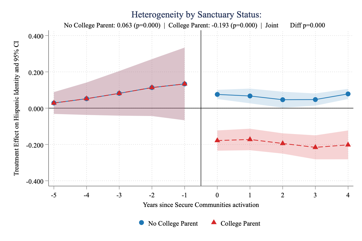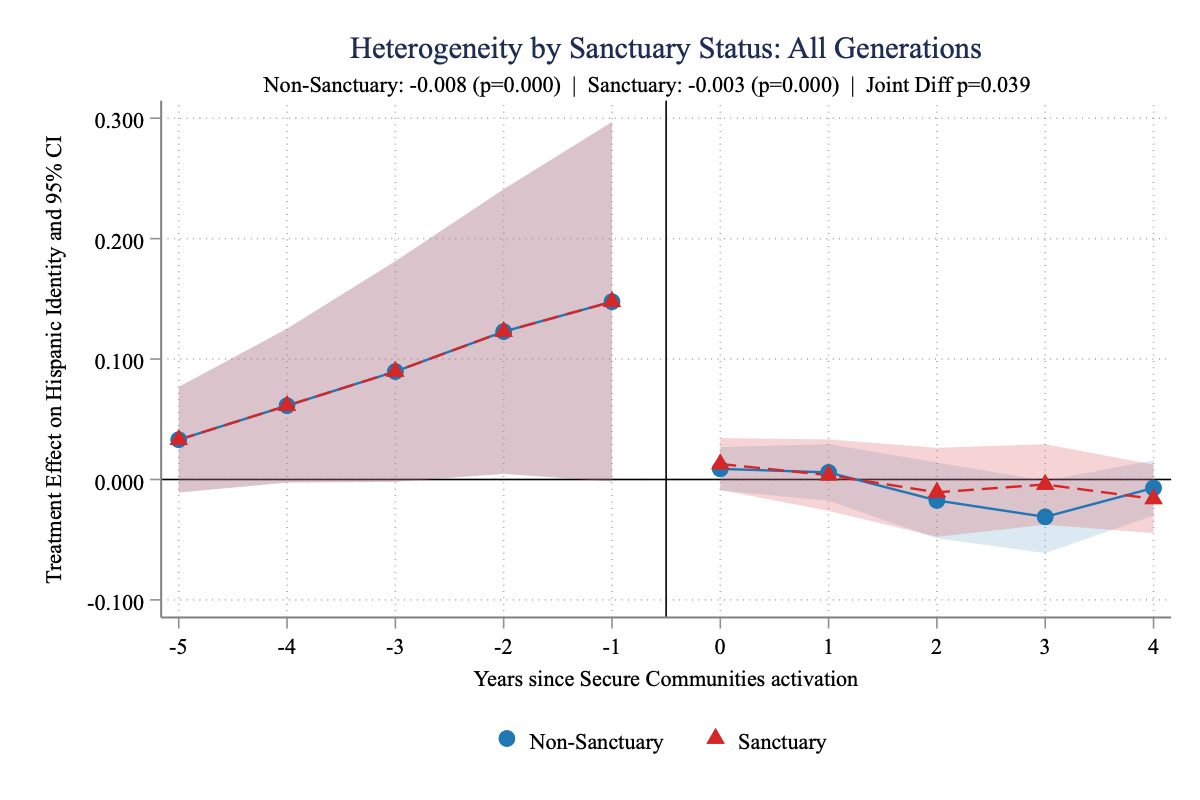 We study how the Secure Communities (SC) program altered Hispanic children’s ethnic self-identification in the American Community Survey. Leveraging staggered SC roll-out across counties, we implement a difference-in-differences strategy to track identification patterns for first- through fourth-generation children. We find that exposure to SC reduces the likelihood that Hispanic children report as Hispanic, with attrition concentrated among children of highly educated parents. Attrition appears across every generation we study, spanning first- through fourth-generation youth. Comparisons across sanctuary and non-sanctuary jurisdictions yield similar declines, indicating that local sanctuary policies do not offset SC-driven identity loss.