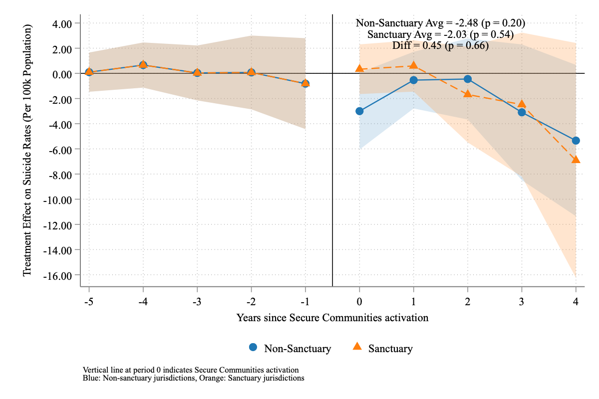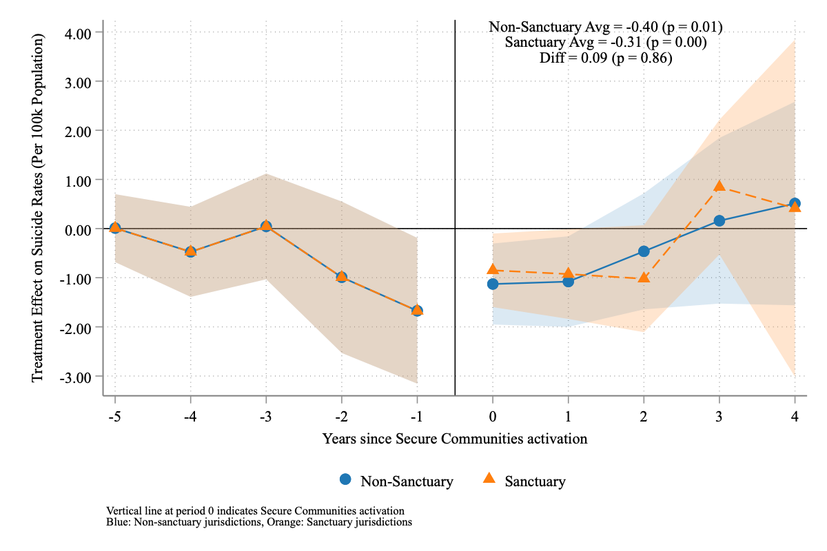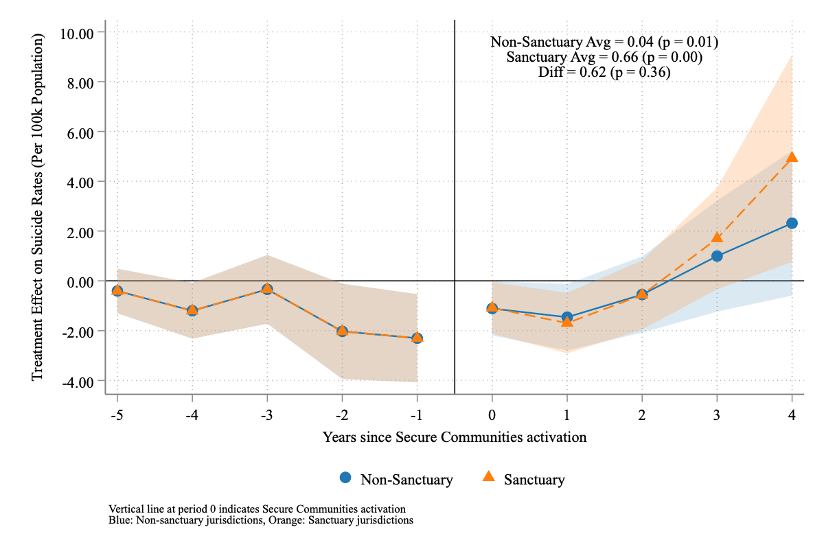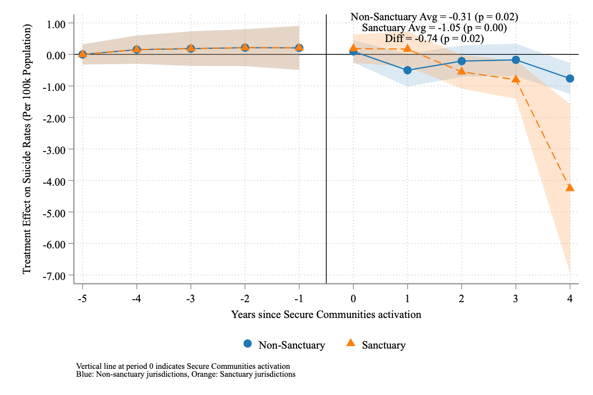 I estimate the causal impact of the US Secure Communities (SC) program—which greatly expanded deportation risk nationwide—on suicide rates among Hispanic populations. Exploiting SC’s staggered county-level rollout between 2008 and 2013, I use the triple difference-in-differences (DDD) estimator proposed by Borusyak, Jaravel, and Spiess (2024) to identify causal effects. The DDD comparisons between Hispanic and non-Hispanic Whites reveal striking heterogeneity across age groups: Hispanic children aged 5-14 experience decreases of 0.35-1 suicides per 100,000 (35-100% relative decreases), and adolescents aged 15-24 show reductions of 2.2 suicides per 100,000, while Hispanic adults aged 34+ suffer increases of 0.5-2.6 suicides per 100,000 in years 2-4 post-implementation. Local contexts significantly moderate these effects: counties with stronger economic conditions show more protective effects, while Democratic-leaning counties experience larger increases in adult suicide rates. Sanctuary counties provide enhanced protection for youth (reductions of 4.25 vs 0.76 suicides per 100,000 for children) but simultaneously show greater adverse effects for adults (increases of 4.93 vs 2.32 suicides per 100,000) compared to non-sanctuary counties. Because Hispanic ethnicity is often underreported in mortality data, these estimates likely understate the true effects. Overall, the evidence suggests that immigration enforcement produces complex mental health impacts fundamentally shaped by age, gender, and local economic and political environments.