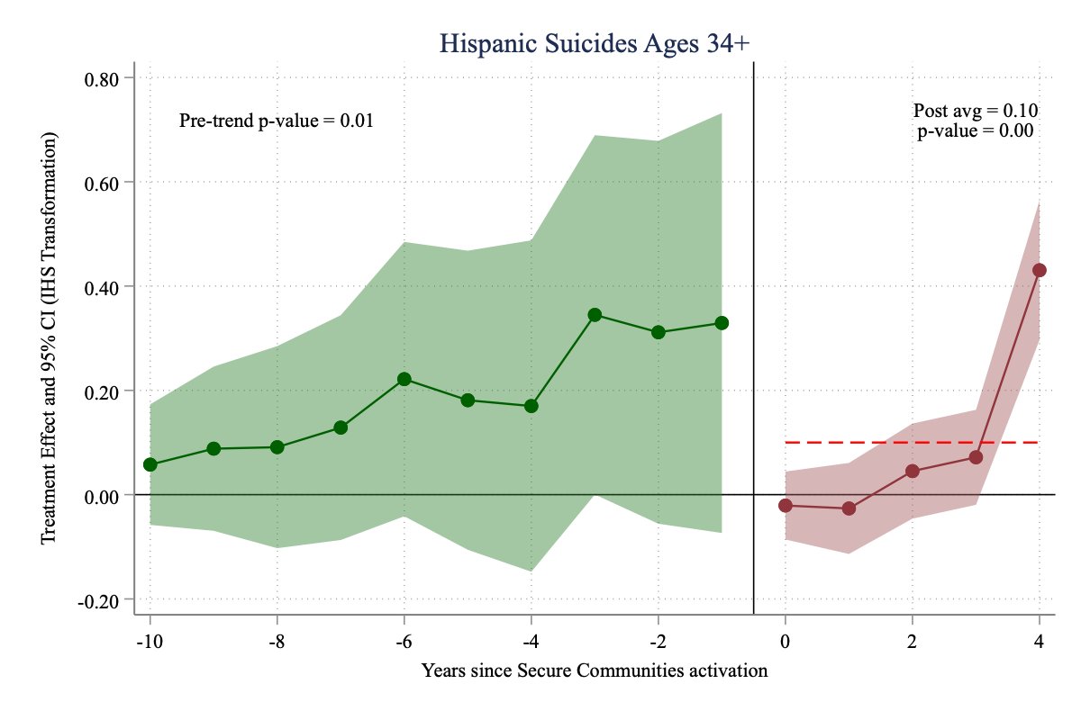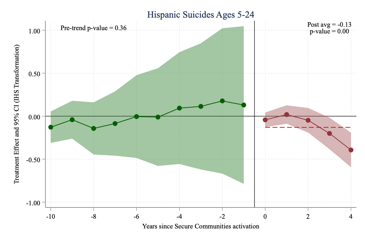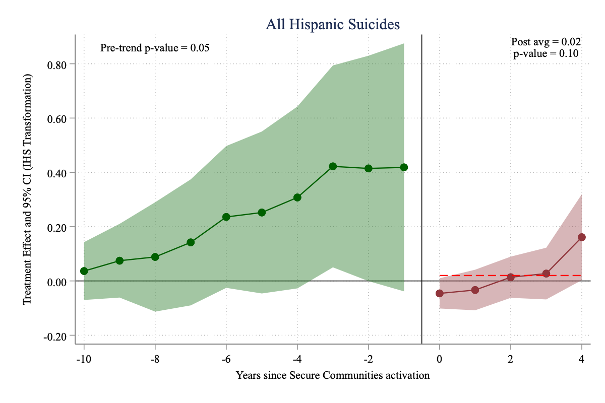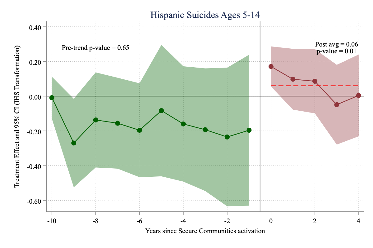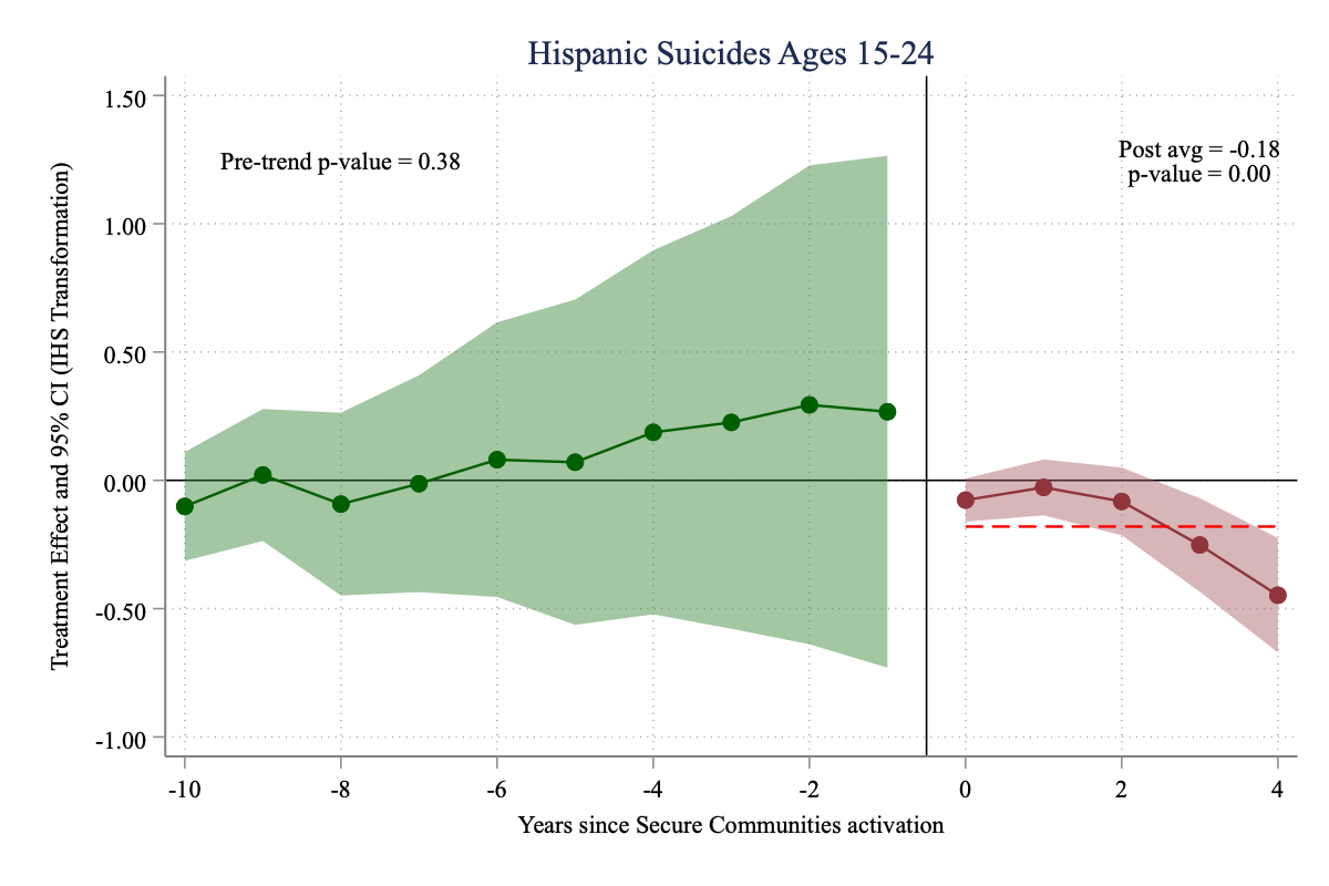 I estimate the causal effect of the US Secure Communities (SC)—a nationwide immigration enforcement program that greatly expanded deportation risk—on suicide rates among Hispanic populations. Using the program’s staggered county-level roll-out from 2008 to 2013, I use the Borusyak, Jaravel, and Spiess (2024) method to identify causal impacts. The results reveal heterogeneous effects across age groups: SC led to a 6% increase in suicide rates among Hispanic children aged 5-14, but an 18% decrease among Hispanic youth aged 15-24, and a 10% increase among Hispanic adults aged 34 and older (equivalent to approximately 300 additional deaths annually for this group). Triple difference-in-differences analysis comparing Hispanic to non-Hispanic White populations shows that Hispanic children and adolescents experienced significant decreases in suicide rates relative to their White counterparts, while Hispanic adults showed increases of up to 60% relative to Whites. Due to likely underreporting of Hispanic ethnicity in vital statistics, my results probably underestimate the true influence of immigration enforcement on mental health outcomes. The analysis reveals significant variations depending on local policy contexts: sanctuary counties generally showed stronger protective effects for younger Hispanic populations but similar or greater adverse effects for older adults compared to non-sanctuary counties. The results reveal that aggressive immigration enforcement has complex, age-specific impacts on mental health, with particularly concerning effects on older Hispanic adults.