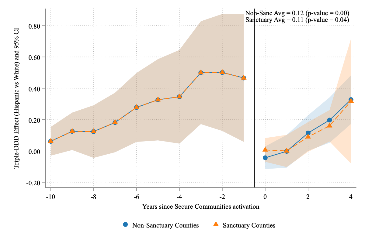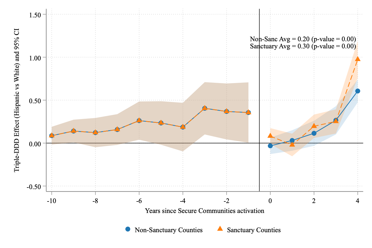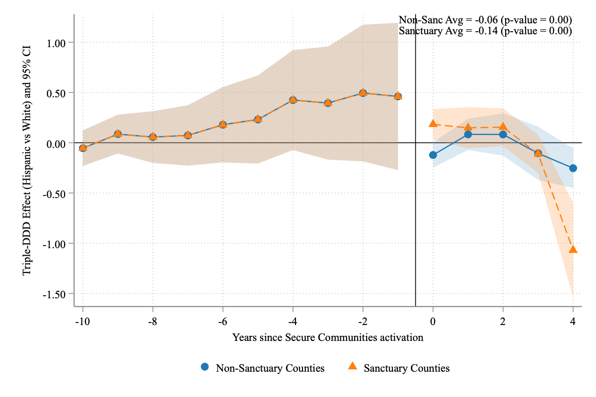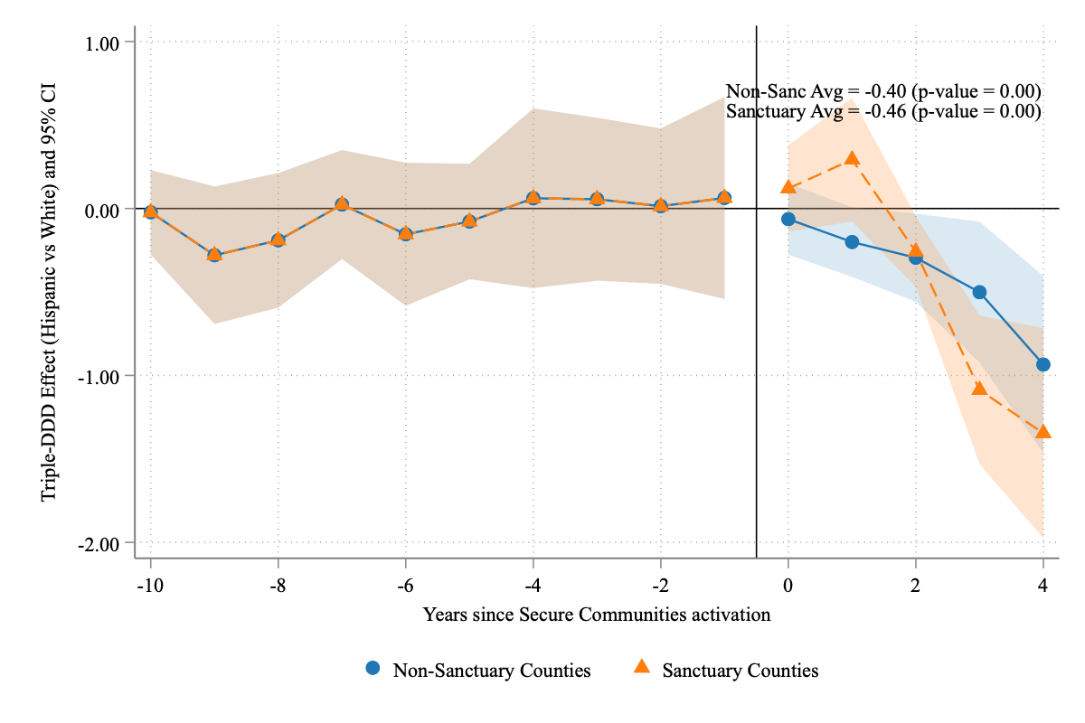 I estimate the causal effect of the US Secure Communities (SC)—a nationwide immigration enforcement program that greatly expanded deportation risk—on suicide rates among Hispanic populations. Using the program’s staggered county-level roll-out from 2008 to 2013, I use the Borusyak, Jaravel, and Spiess (2024) method to identify causal impacts. The results reveal heterogeneous effects across age groups: SC led to a 6% increase in suicide rates among Hispanic children aged 5-14, but an 18% decrease among Hispanic youth aged 15-24, and a 10% increase among Hispanic adults aged 34 and older (equivalent to approximately 300 additional deaths annually for this group). Triple difference-in-differences analysis comparing Hispanic to non-Hispanic White populations shows that Hispanic children and adolescents experienced significant decreases in suicide rates relative to their White counterparts, while Hispanic adults showed increases of up to 60% relative to Whites. Due to likely underreporting of Hispanic ethnicity in vital statistics, my results probably underestimate the true influence of immigration enforcement on mental health outcomes. The analysis reveals significant variations depending on local policy contexts: sanctuary counties generally showed stronger protective effects for younger Hispanic populations but similar or greater adverse effects for older adults compared to non-sanctuary counties. The results reveal that aggressive immigration enforcement has complex, age-specific impacts on mental health, with particularly concerning effects on older Hispanic adults.